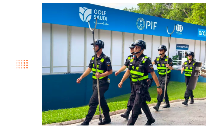 相较于去年的沙特阿美系列赛,本届赛事升级为赛季收官战,不仅赛制融合个人赛与队际赛的双重竞技模式,更因"决赛轮公众免费入场"吸引了海量人流。针对赛事规格提升、流程更复杂、观众结构多元等新特点,恒博保安公司王兆生总经理牵头组建了专案工作小组,多次召开会议统筹推进各项安保筹备工作,同时结合球场布局与赛事流程节点,开展多轮现场勘察,制定赛事安保方案。