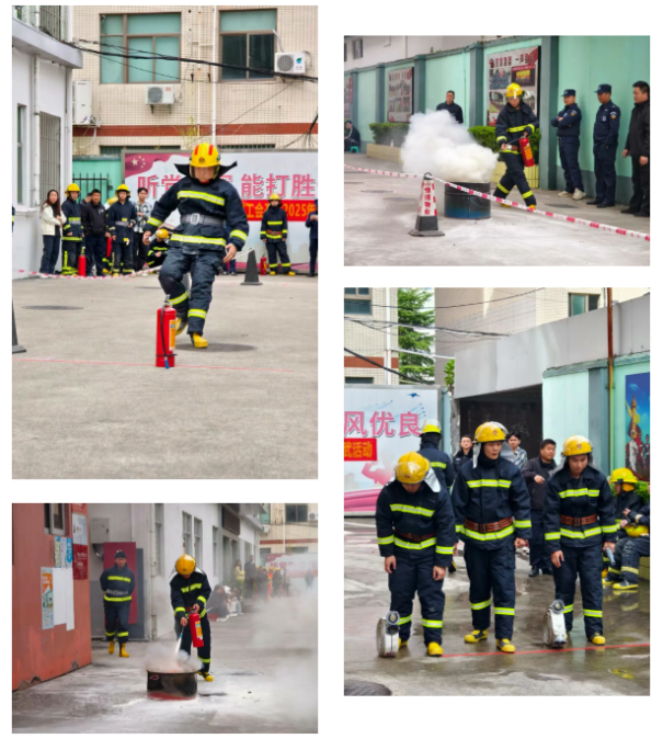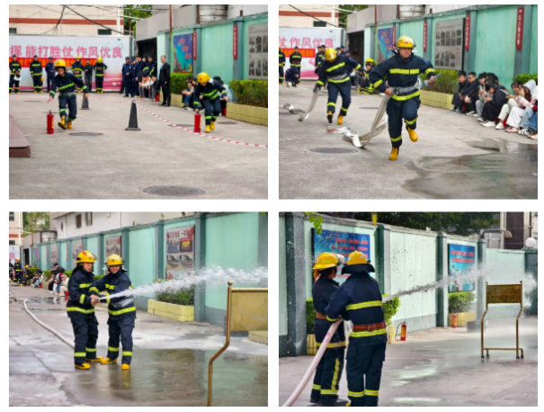 干粉灭火操评比中,选手手提灭火器精准冲向"着火点",沉着完成拔销、握管、压阀、扫射等动作,转瞬便将模拟火点彻底扑灭;消火栓快速出水操环节,参赛选手们以4人为一队,只见他们快速连接水带、稳固水带接口,精准操控水枪方向直指目标区域,展现出扎实的实操功底,围观员工的加油声、呐喊声此起彼伏。