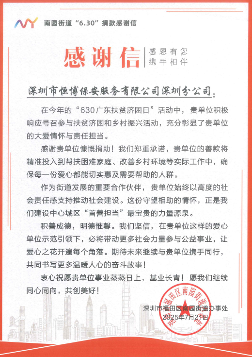 近日,深圳市恒博保安服务有限公司深圳分公司积极参与“6.30广东扶贫济困日”活动,响应号召慷慨捐款,助力扶贫济困与乡村振兴工作,展现了企业的社会责任与担当,获得南园街道办事处专函致谢。